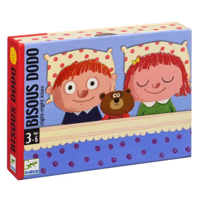 Règle du jeu : Le joueur sort tout le contenu de la boîte, et remet dans le fond de la boîte l’un des 2 personnages (au choix) sur le matelas, côté « éveillé » (yeux ouverts). On écarte du jeu l’autre personnage. Le meneur du jeu mélange bien les cartes et donne la pile au joueur, faces cachées. Le joueur les retourne une par une, devant lui. Les cartes qu’il retourne sont autant de bisous, petites chansons et autres chatouilles qu’il recevra plus tard. Attention !, chaque fois qu’il retourne une carte « soleil », il doit supprimer 1, 2, ou 3 cartes (selon le nombre de soleils sur la carte) de son tas constitué. Les cartes « soleil » et les cartes supprimées sont aussitôt écartées du jeu. Lorsqu’il retourne la carte « oreiller », le joueur la place sous la tête du personnage dans son lit. La carte « draps » doit être placée sur les jambes, et la carte « doudou » auprès de lui sous ou sur le drap. Dès que ces 3 cartes sont réunies, la partie s’arrête. Le joueur donne au meneur toutes ses cartes gagnées. Le meneur les retourne une à une et prodigue les bisous, les chatouilles, chante les chansons en fonction des cartes obtenues (voir carte « index »). Lorsque la pile des cartes gagnées est épuisée, on retourne l’enfant dans son lit (côté « endormi »), et on lui souhaite bonne nuit avant d’aller se coucher !