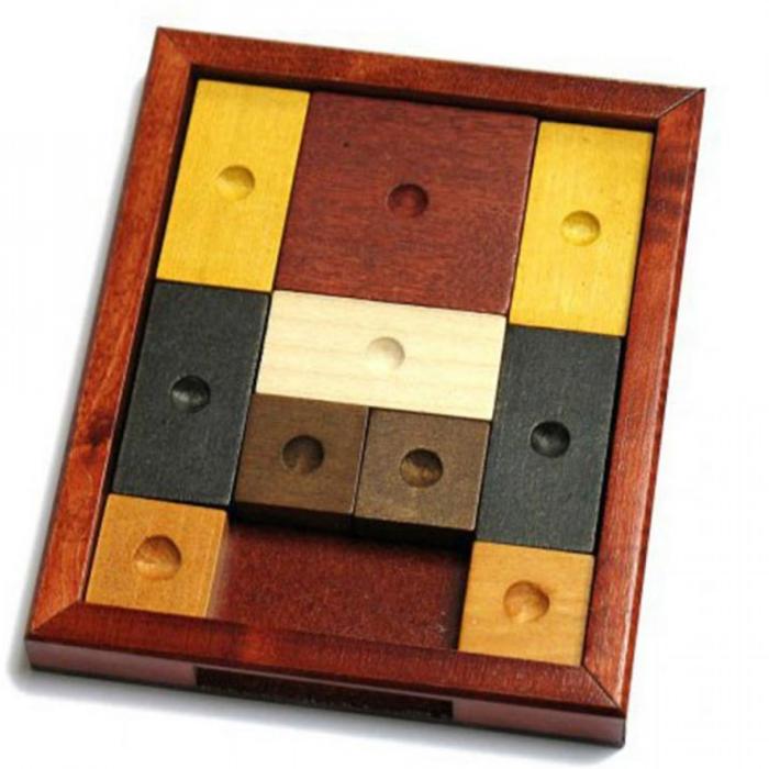 Règle du jeu : Prendre une carte et placer les pièces dans le cadre comme indiqué. A partir de cette position de départ, le joueur choisit un niveau de difficulté et un problème à réaliser. Il déplace les pièces horizontalement ou verticalement dans l’espace libre. Par glissements successifs, il doit sortir par l’ouverture du cadre la ou les 2 pièces choisies.