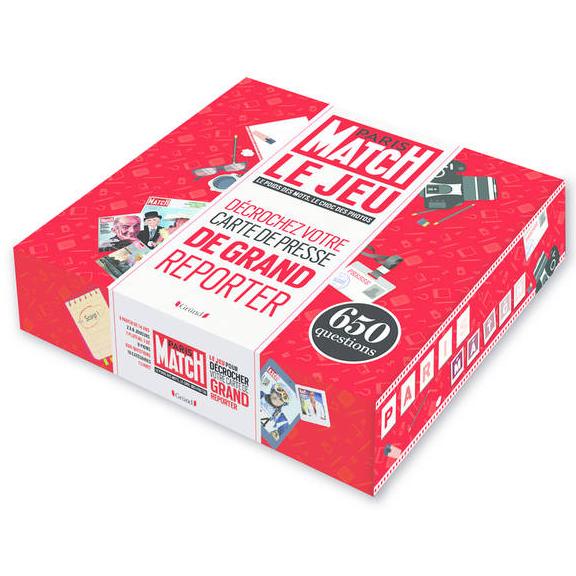 Le poids des mots, le choc des photos ! Paris Match met son slogan emblématique au coeur de ce jeu de plateau pour 2 à 8 joueurs qui mettra votre culture générale à rude épreuve. Répondez aux questions, recomposez les unes (historiques !) du journal, évitez les embûches semées par vos concurrents… mais dépêchez-vous de gagner les 10 tampons nécessaires à l’obtention de votre carte de presse, car il n’y a qu’une seule place à pourvoir au sein de la rédaction !