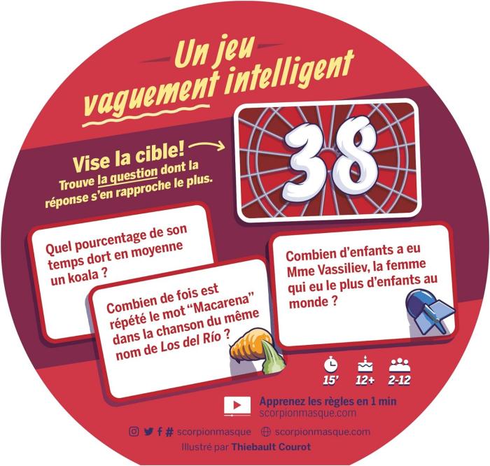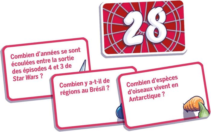 VOTRE OBJECTIF : Formez jusqu’à 3 équipes. Discutez avec votre équipe pour trouver laquelle de vos cartes Question comporte la réponse la plus proche de la cible (entre 0 et 100). Vous n’avez pas besoin de connaître la réponse exacte à la question, il vous suffit d’en vous rapprocher le plus possible !
